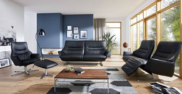 Die Lounger-Modelle des Typs FLÜELA bestechen durch ihre moderne Gestaltung, eine filigrane Formensprache und ästhetische Fusslösungen. Sie sind alternativ mit Metallkufen in Edelstahloptik oder Anthrazit ausgestattet. Manuell oder elektrisch verstellbare Kopfstützen ergänzen das stilvolle Design der Hochlehner mit attraktiver Sattlernaht und schmalem Seitenteil. Die stufenlose elektrische Fuss- und Rückenteil-Verstellung erfolgt mittels eines Kippschalters, der sich seitlich am Sitz befindet. Optional können Sie sich für einen aussen liegenden Akku entscheiden. Sie haben ausserdem die Wahl zwischen drei Sitzhärten - je nachdem, ob Sie lieber weich sitzen oder eine festere Polsterung mit Federkern bevorzugen.