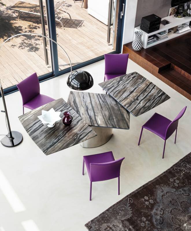 ADLER ist ein ausziehbarer bootsförmiger oder rechteckiger Esstisch erhältlich in verschiedenen Materialien, mit unter der Platte liegenden Auszugsplatten. Mit Hilfe einer perfekten Mechanik aus Stahl und Aluminium fügt man an den Schmalseiten der monolithischen Tischplatte jeweils eine 50 cm messende Verlängerung an. Der Standardsockel ist ein Ovalsockel in V2A matt geschliffen. Weitere Sockeltypen stehen zur Auswahl.