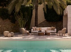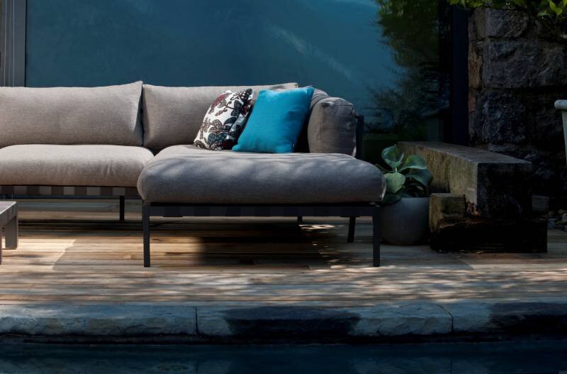 Das Design von NATAL ALU ist typisch Tribù: Ein subtiler Rahmen mit ästhetisch gebogenen Armlehnen. Der Rahmen kontrastiert mit dem Volumen der Kissen.