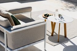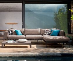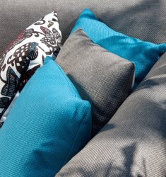 Der Aluminiumrahmen ist mit einem aus breiten Bändern bestehenden Geflecht aus Textilen bespannt. Dieser Rahmen bildet die Tragkonstruktion für die Sitzkissen. Auch ohne Kissen wirkt das Sofa noch sehr ästhetisch. Sie können also ruhig die Kissen im Winter hereinholen und weiterhin das schöne Design geniessen.