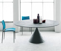 Tisch CLAY mit konischem Fuss aus PU-Hartschaum und mit runder Platte aus gehärtetem Kristallglas, Keramik oder MDF mit Oberfläche aus manuell aufgespachtelter Lavasteinmasse. CLAY ist in vier Grössen erhältlich: Durchmesser 120, 140, 160 oder 180 cm. Der Tisch wurde mit diversen renommierten Preisen ausgezeichnet. Das Modell steht in neuen Versionen mit ovaler Platte oder als niedriger Tisch in zahlreichen Farben und Ausführungen zur Verfügung.