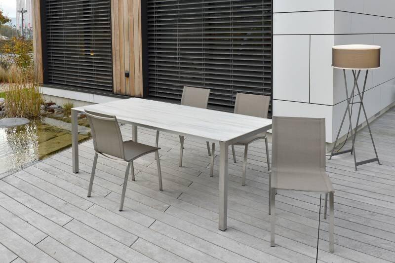 Edelstahl Stuhl ohne Armlehnen mit Textilbespannung, stapelbar.
