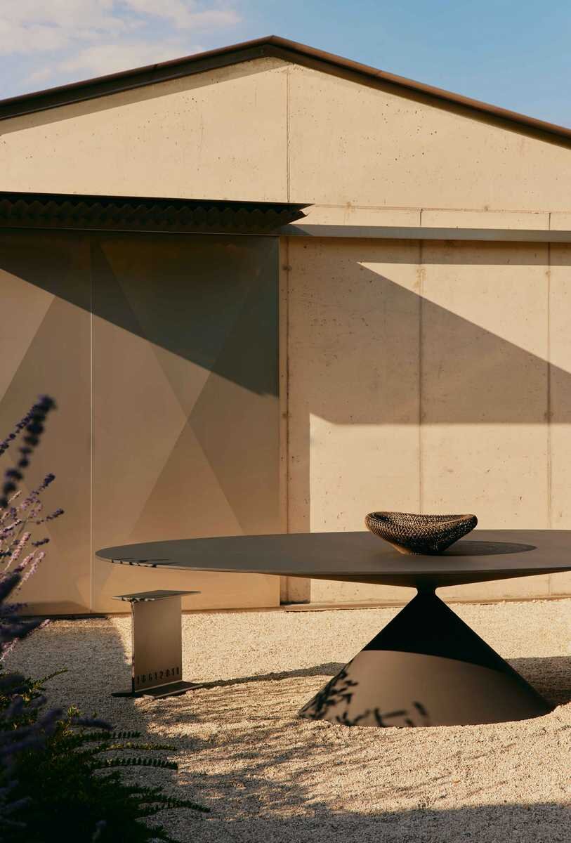 Tisch CLAY mit konischem Fuss aus PU-Hartschaum und mit runder Platte aus gehärtetem Kristallglas, Keramik oder MDF mit Oberfläche aus manuell aufgespachtelter Lavasteinmasse. CLAY ist in verschiedenen Grössen und Formen erhältlich.