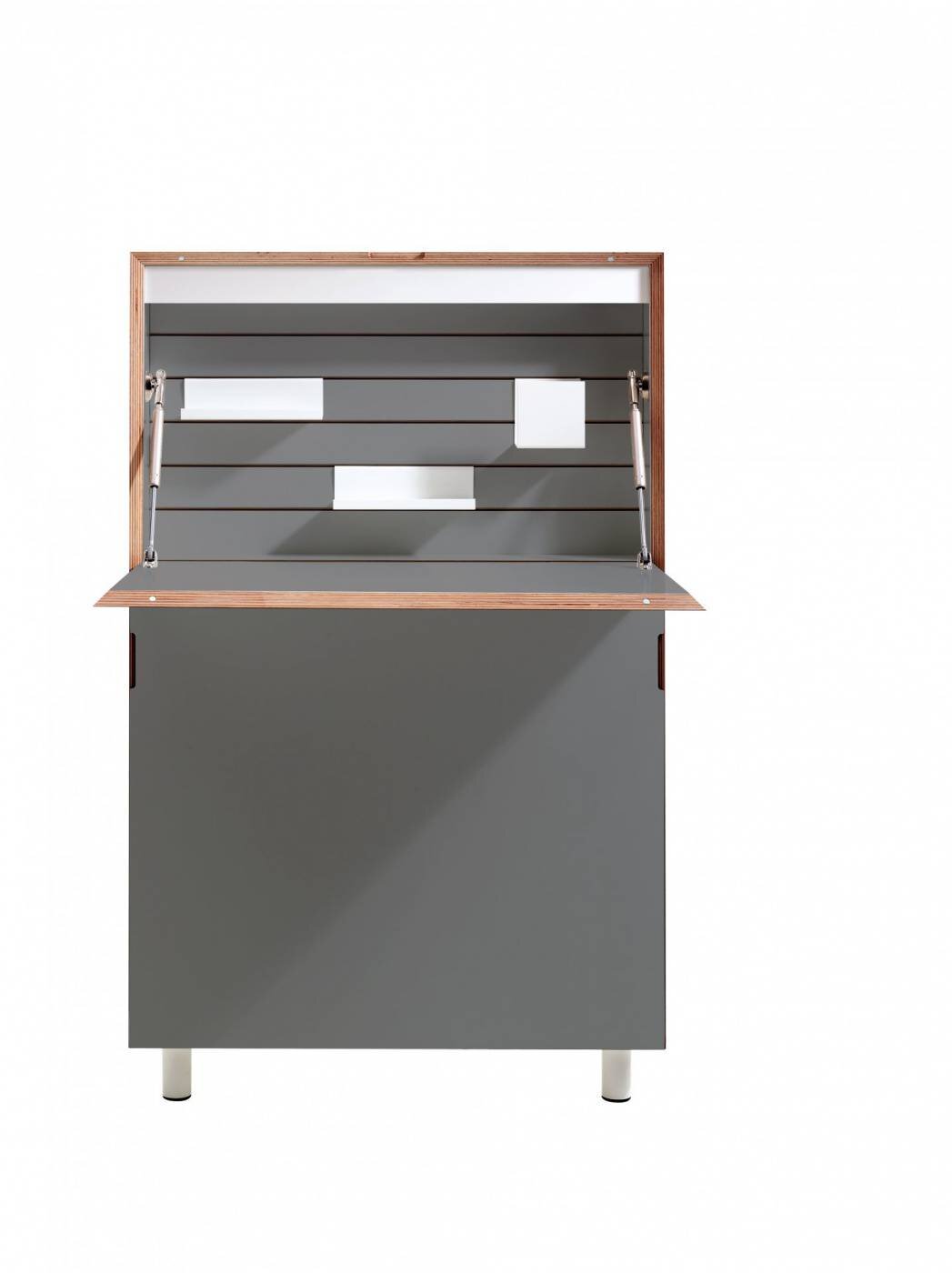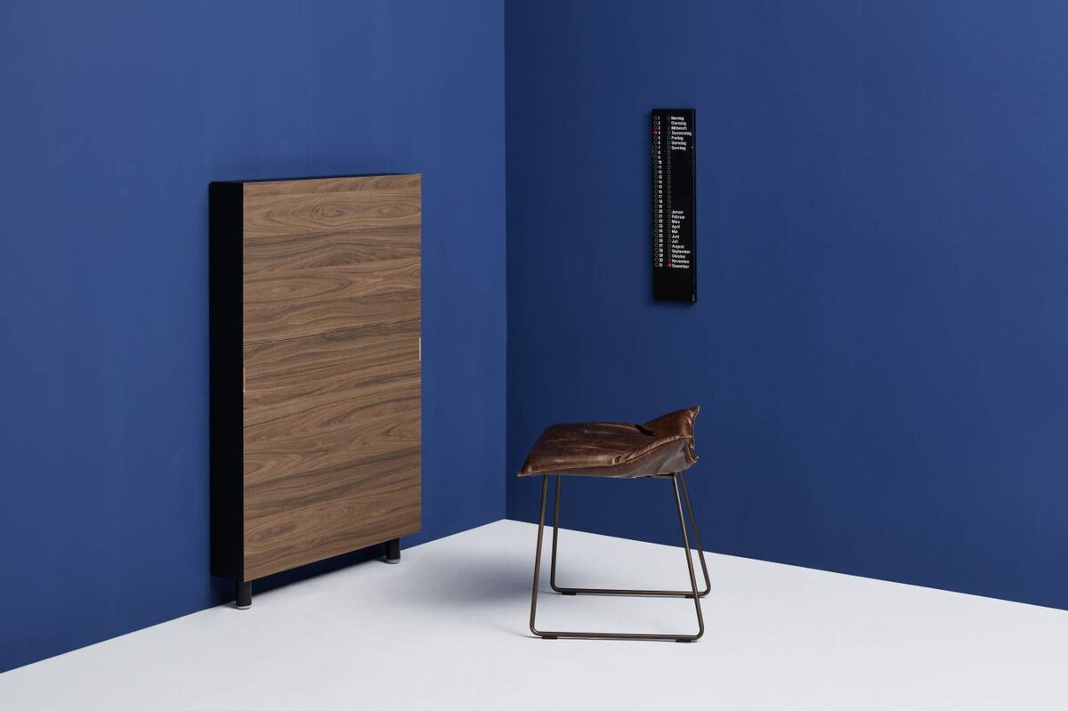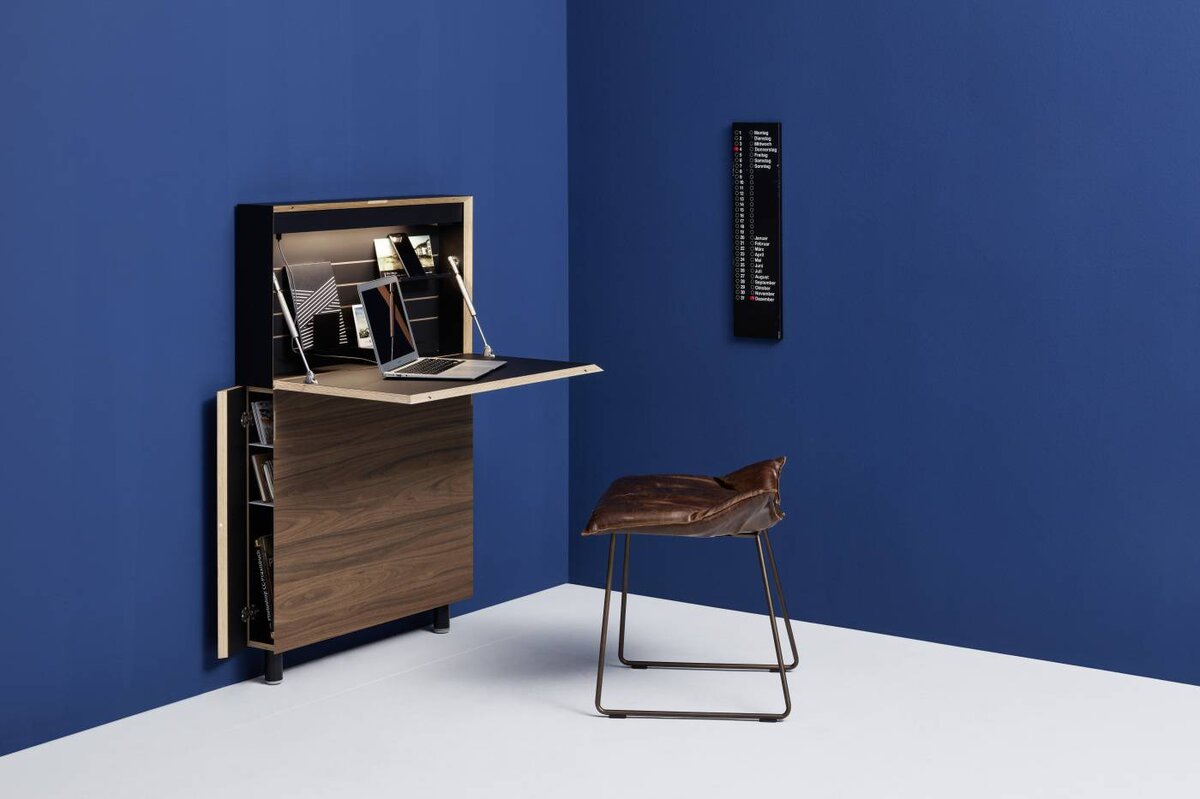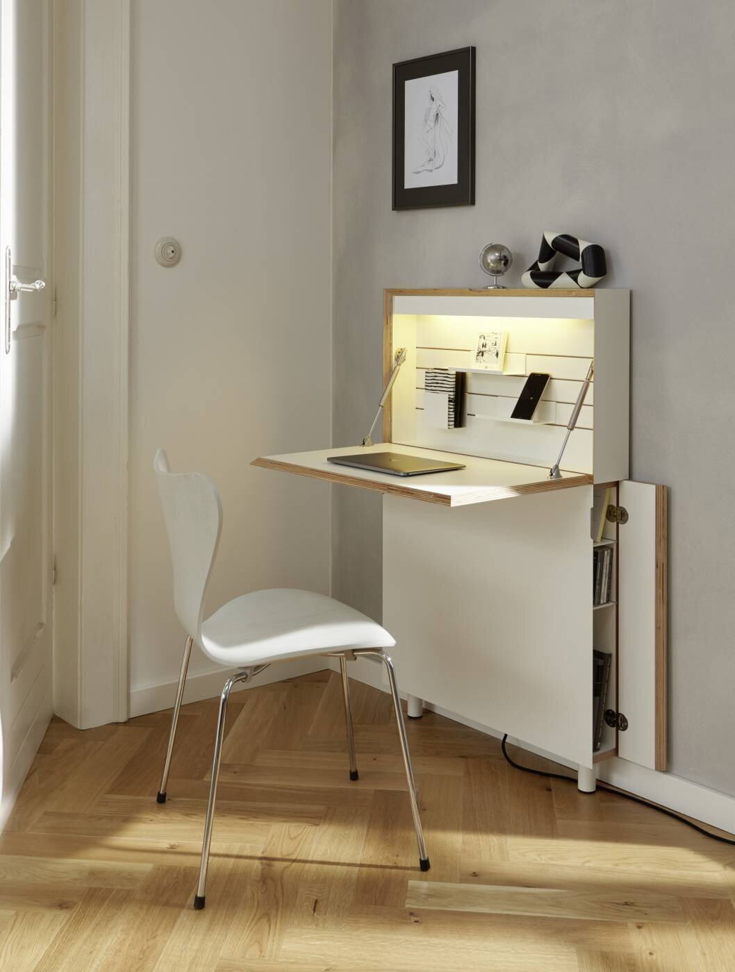 FLATMATE besitzt im geschlossenen Zustand eine Grundfläche von lediglich 0,09 m² und dürfte somit der kleinste voll ausgestattete Sekretär auf dem Markt sein. Durch seine geringe Bautiefe und das schlichte unauffällige Äussere verwandelt er lange Altbauflure bei Bedarf in ein Homeoffice, bietet im Schlafzimmer einen Ort zum Briefeschreiben oder dient im Wochenendhaus als temporärer Arbeitsplatz. FLATMATE macht sogar solche Räume sinnvoll nutzbar, die für konventionelles Mobiliar ungeeignet sind; auf Grund seiner kompakten Abmessungen ist diese Neuinterpretation des Sekretärs ideal für mobil lebende Nutzer.