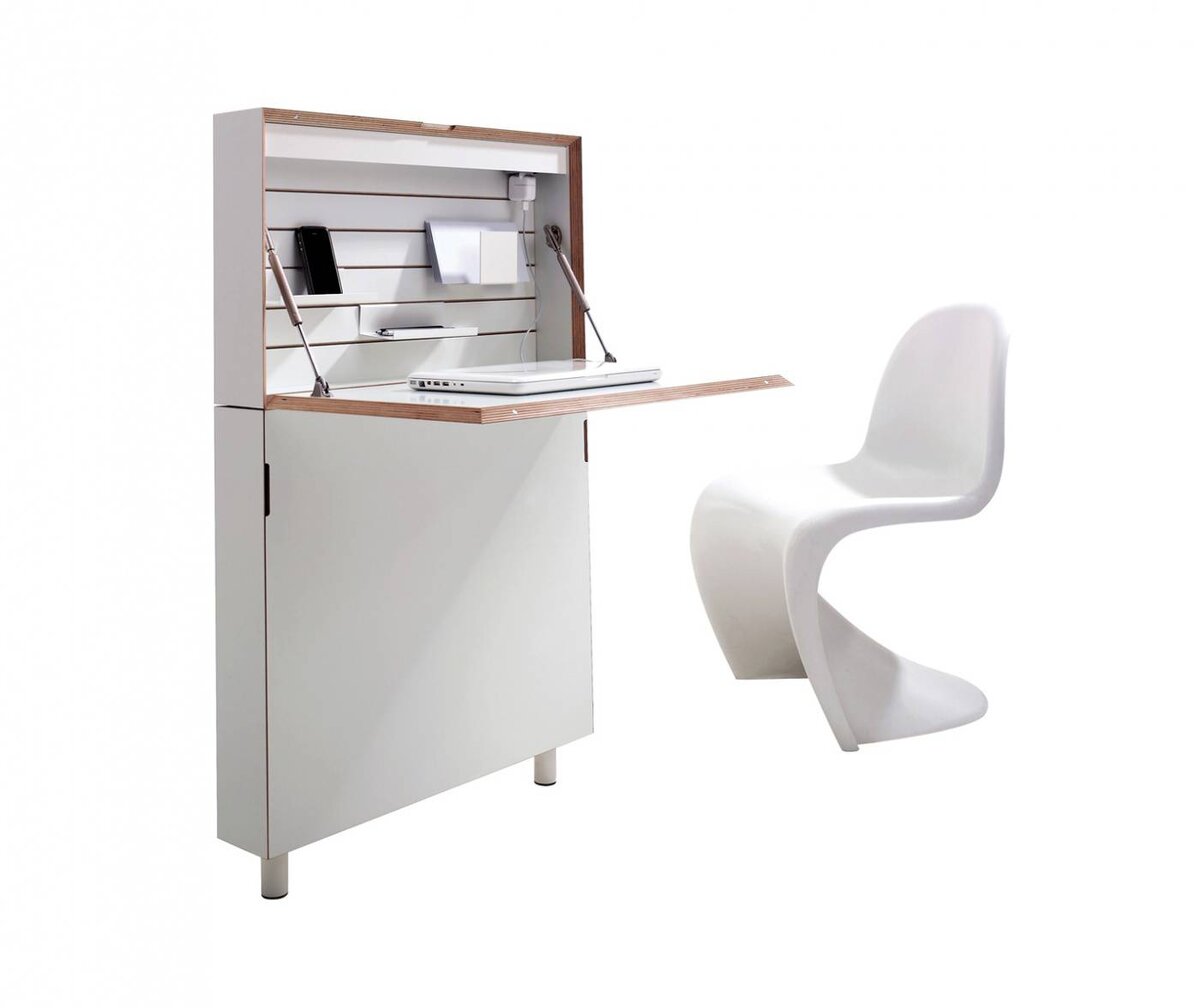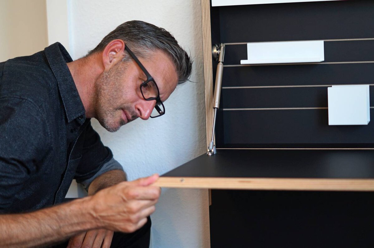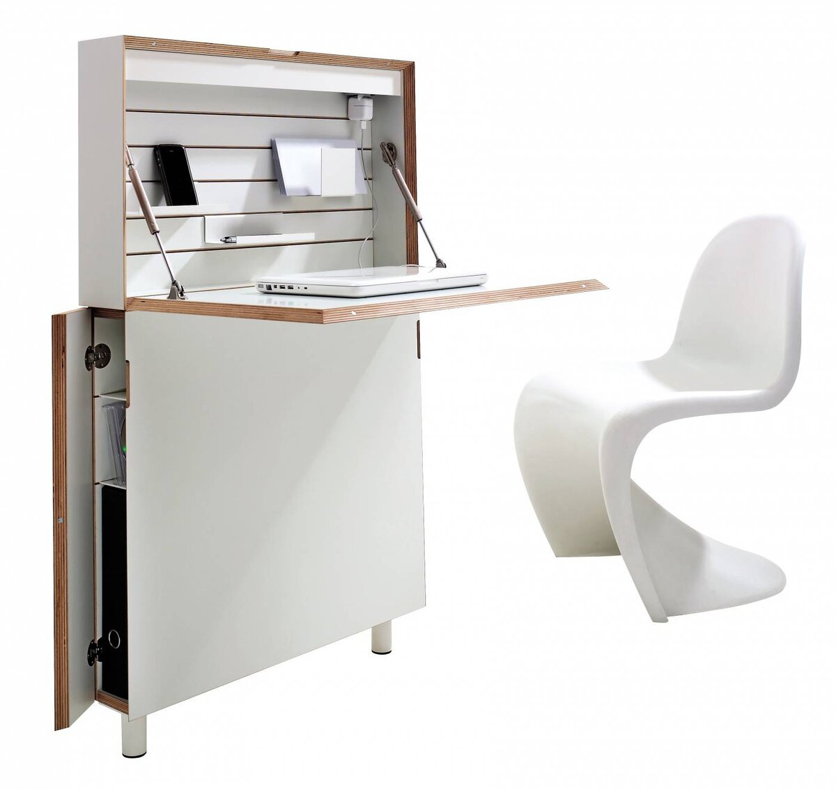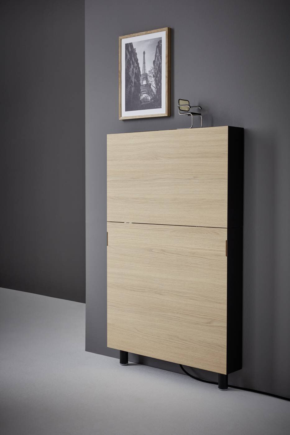 FLATMATE besitzt im geschlossenen Zustand eine Grundfläche von lediglich 0,09 m² und dürfte somit der kleinste voll ausgestattete Sekretär auf dem Markt sein. Durch seine geringe Bautiefe und das schlichte unauffällige Äussere verwandelt er lange Altbauflure bei Bedarf in ein Homeoffice, bietet im Schlafzimmer einen Ort zum Briefeschreiben oder dient im Wochenendhaus als temporärer Arbeitsplatz. FLATMATE macht sogar solche Räume sinnvoll nutzbar, die für konventionelles Mobiliar ungeeignet sind; auf Grund seiner kompakten Abmessungen ist diese Neuinterpretation des Sekretärs ideal für mobil lebende Nutzer.
