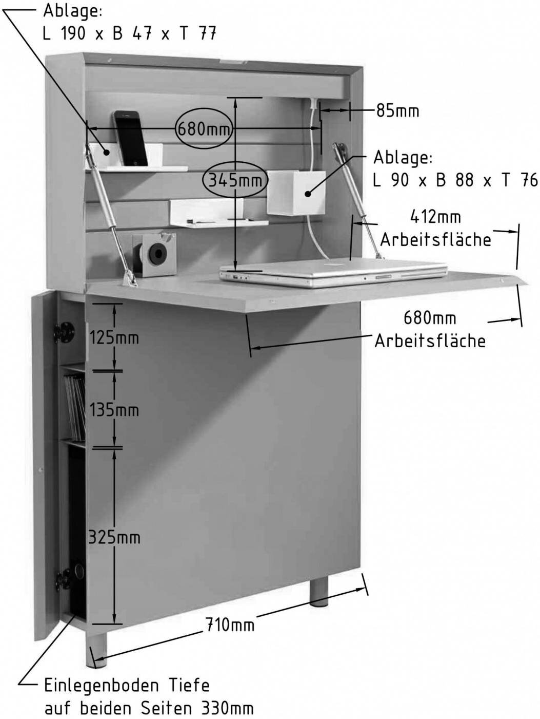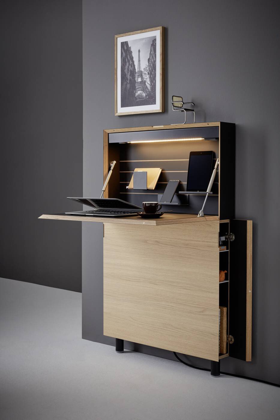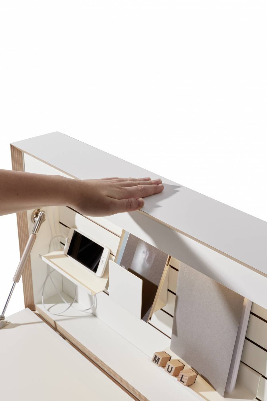 Die integrierte flexible Innenausstattung mit Ablagemöglichkeiten für traditionelle Schreibgeräte sowie Tablet-PC und Co. verbindet Merkmale eines klassischen Möbels mit der neuen Form des vernetzten Lebens und Arbeitens. Ergänzt durch eine Bluetooth-Tastatur (nicht im Lieferumfang erhältlich) wird so aus dem mobilen Tablet-PC ein stationärer ergonomischer Arbeitsplatz mit integrierter Stromversorgung; das Mobiltelefon lässt sich so aufladen. Die blendfreie Beleuchtung sowie die unsichtbare Steckdose werden durch das elegante 1,30 Meter lange schwarze Textilkabel in Funktion gesetzt: plug and work! Hinter den seitlichen Klappen finden zwei 8 cm breite Standardordner, ein 17“ Laptop nebst Zubehör sowie CDs oder Ähnliches Platz.