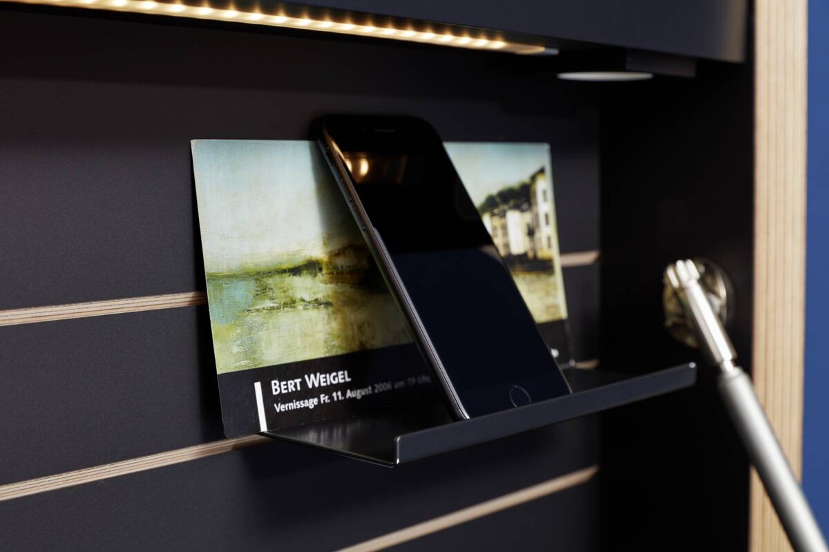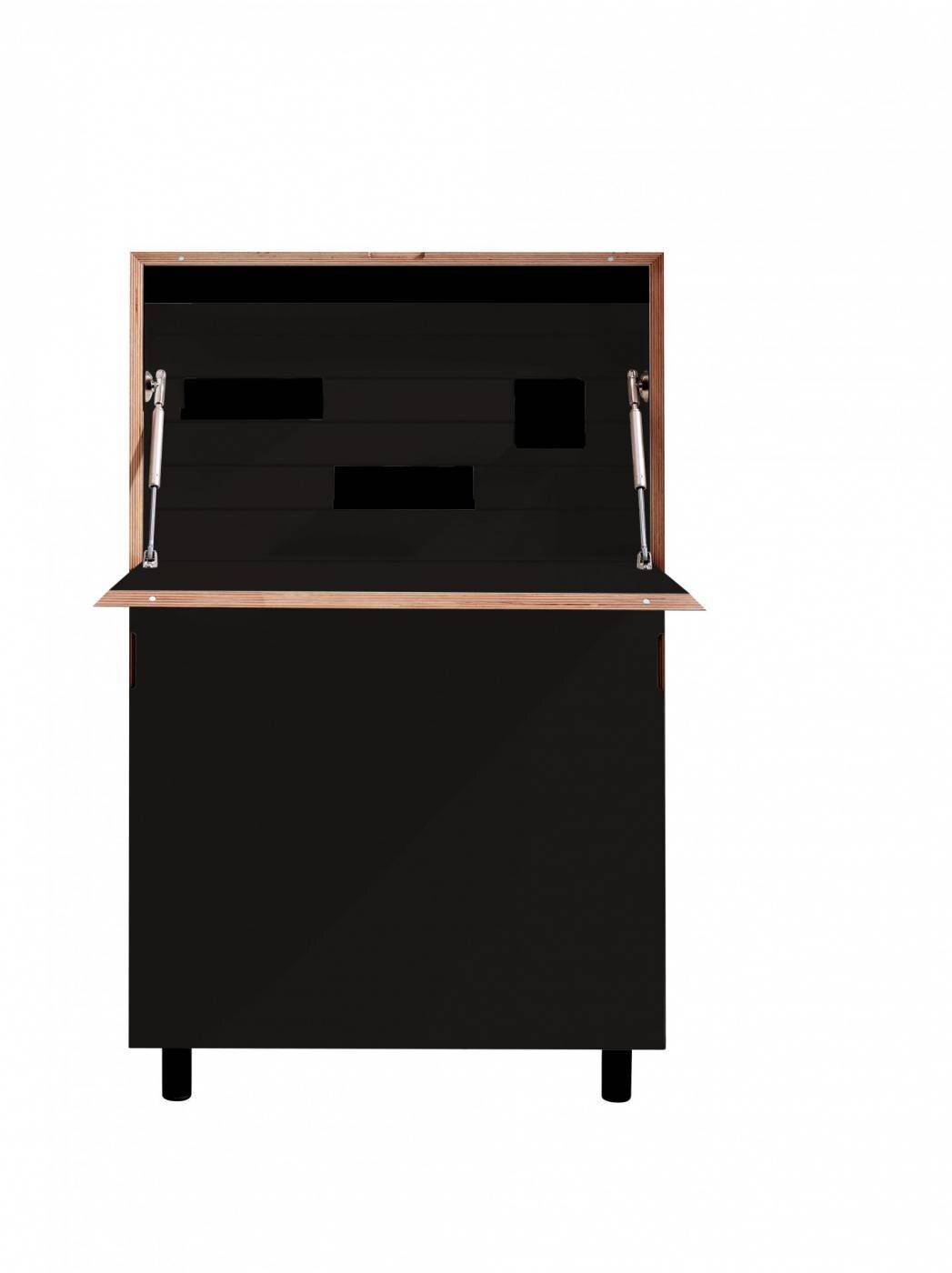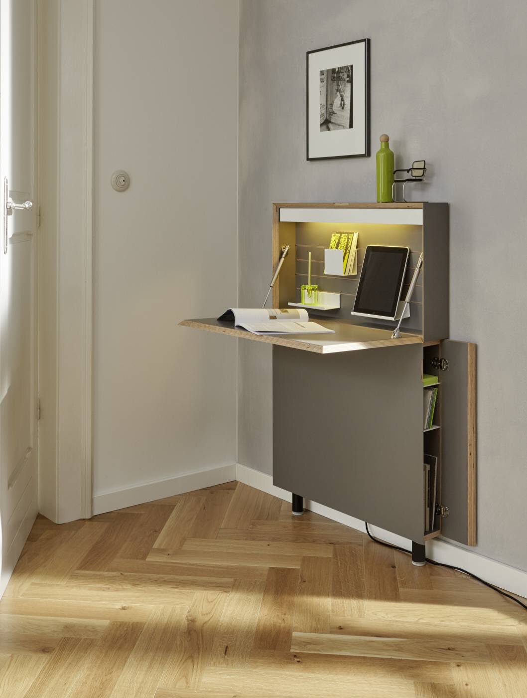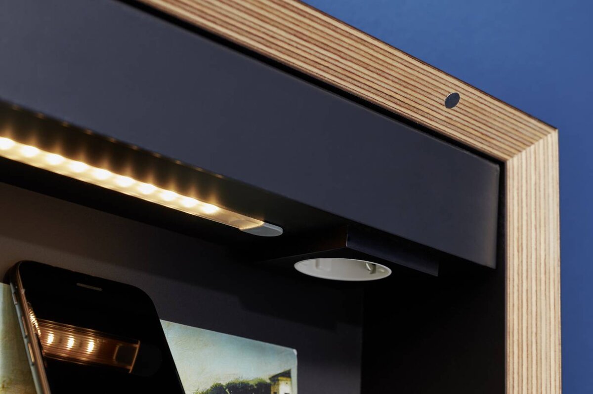Die integrierte flexible Innenausstattung mit Ablagemöglichkeiten für traditionelle Schreibgeräte sowie Tablet-PC und Co. verbindet Merkmale eines klassischen Möbels mit der neuen Form des vernetzten Lebens und Arbeitens. Ergänzt durch eine Bluetooth-Tastatur (nicht im Lieferumfang erhältlich) wird so aus dem mobilen Tablet-PC ein stationärer ergonomischer Arbeitsplatz mit integrierter Stromversorgung; das Mobiltelefon lässt sich so aufladen. Die blendfreie Beleuchtung sowie die unsichtbare Steckdose werden durch das elegante 1,30 Meter lange schwarze Textilkabel in Funktion gesetzt: plug and work! Hinter den seitlichen Klappen finden zwei 8 cm breite Standardordner, ein 17“ Laptop nebst Zubehör sowie CDs oder Ähnliches Platz.