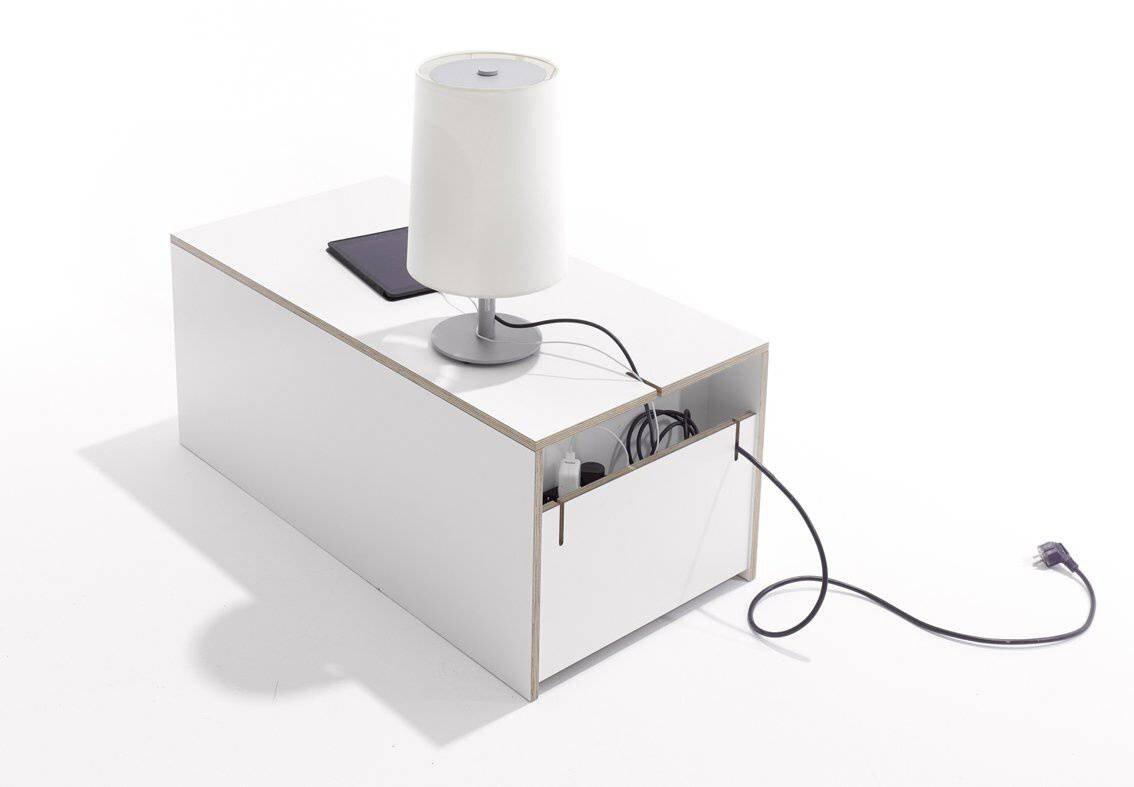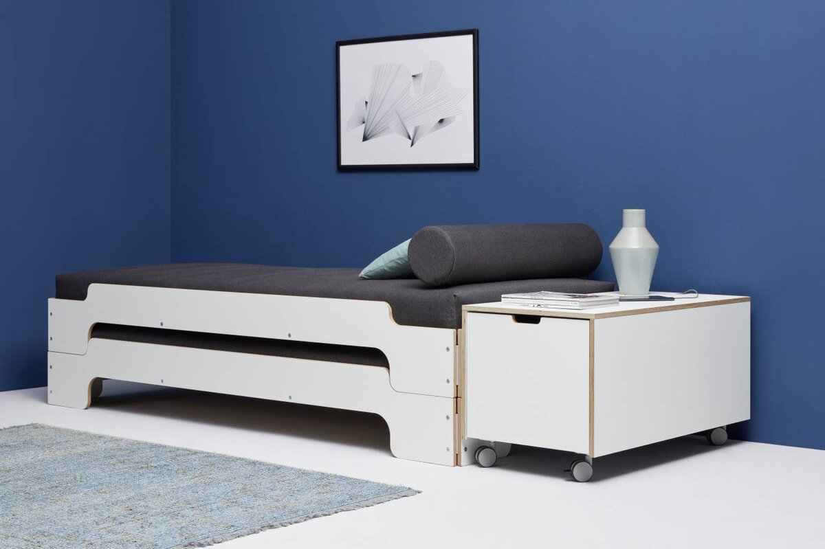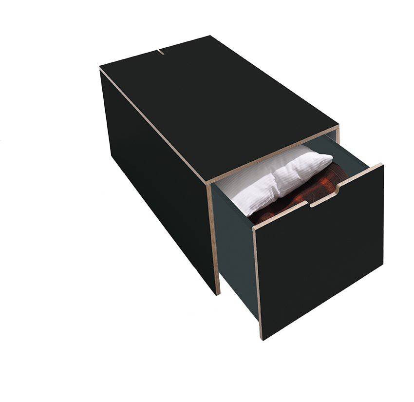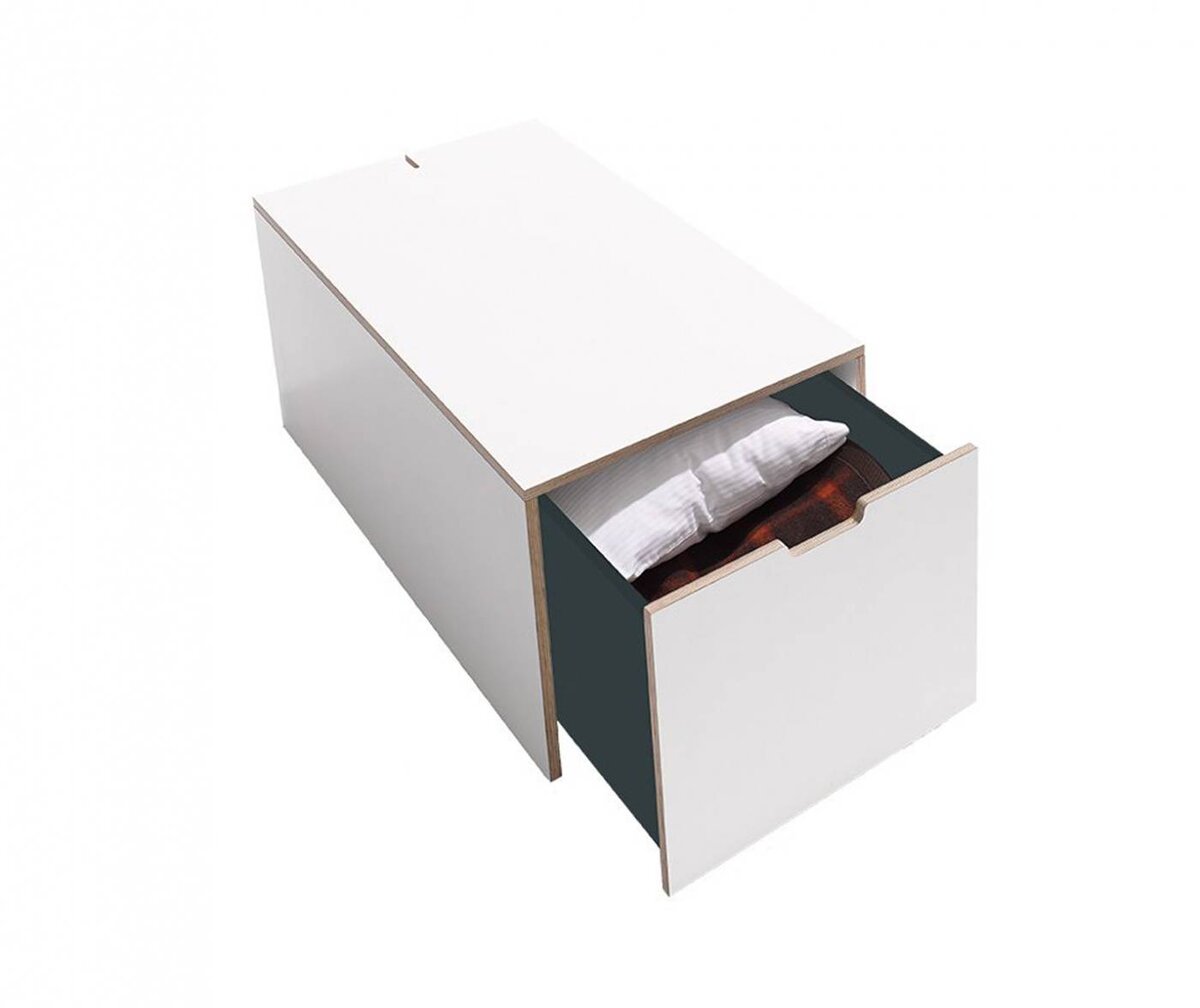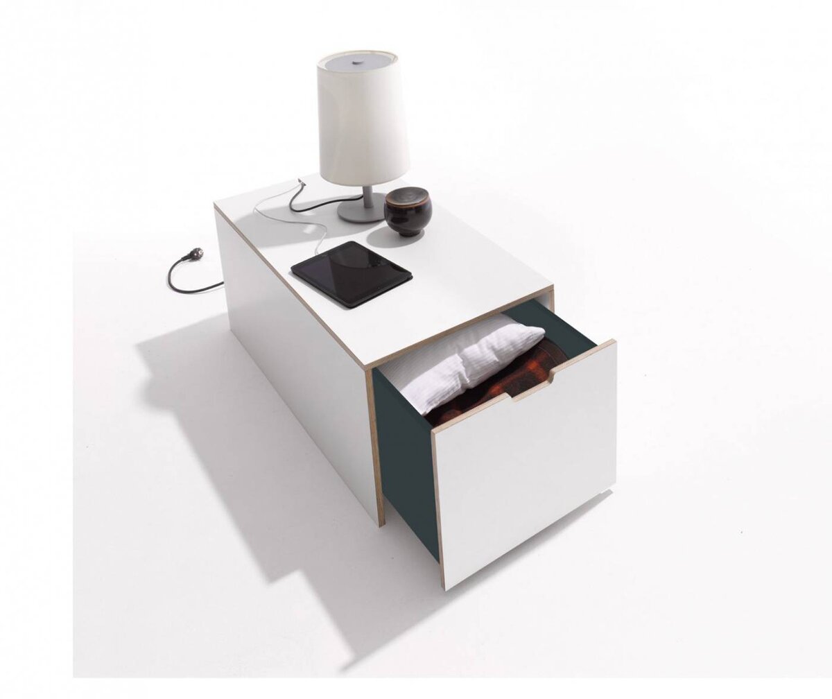Der neue Bettkasten für die Stapelliege verfügt über einen geräumigen Schubkasten und eine simple aber dennoch innovative Kabelführung auf der Rückseite. Er bietet somit viel Stauraum und zugleich eine große Ablagefläche. Die perfekte Ergänzung des Klassikers.