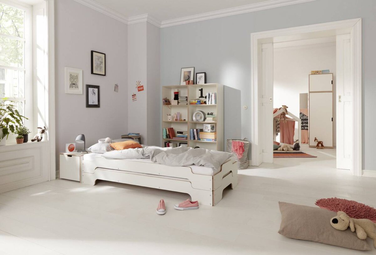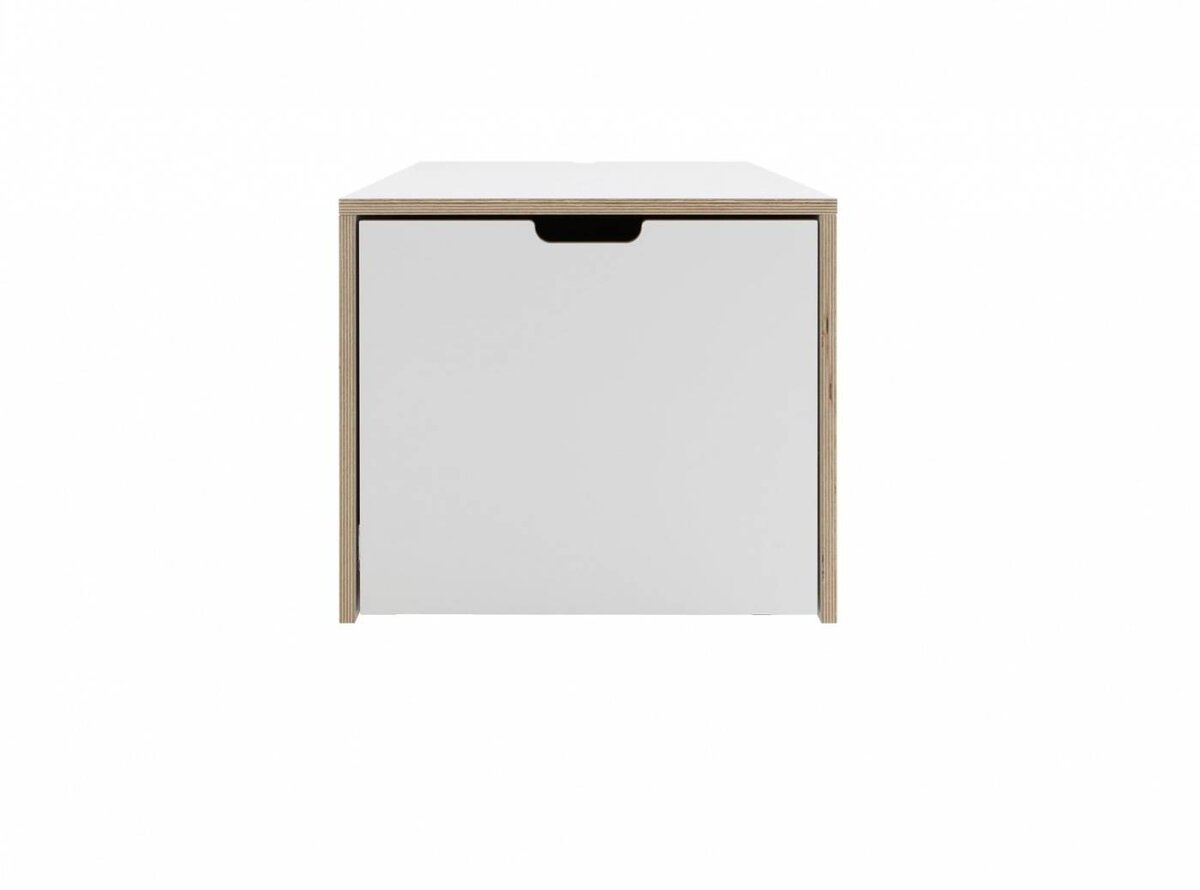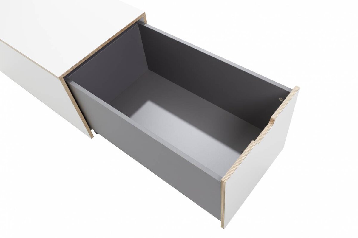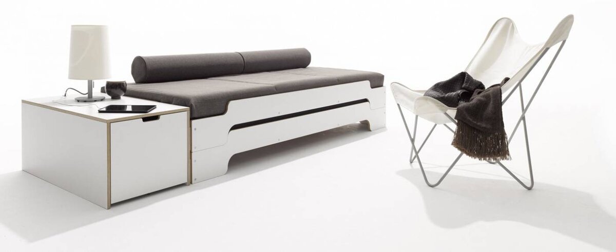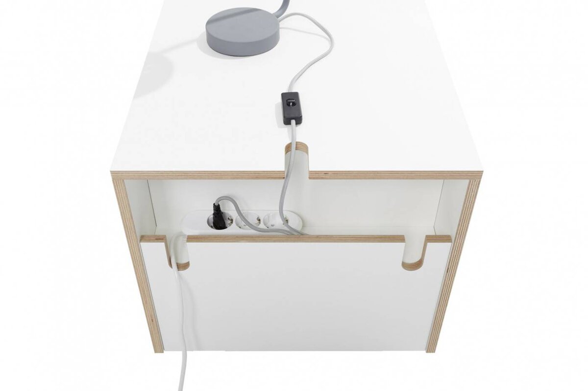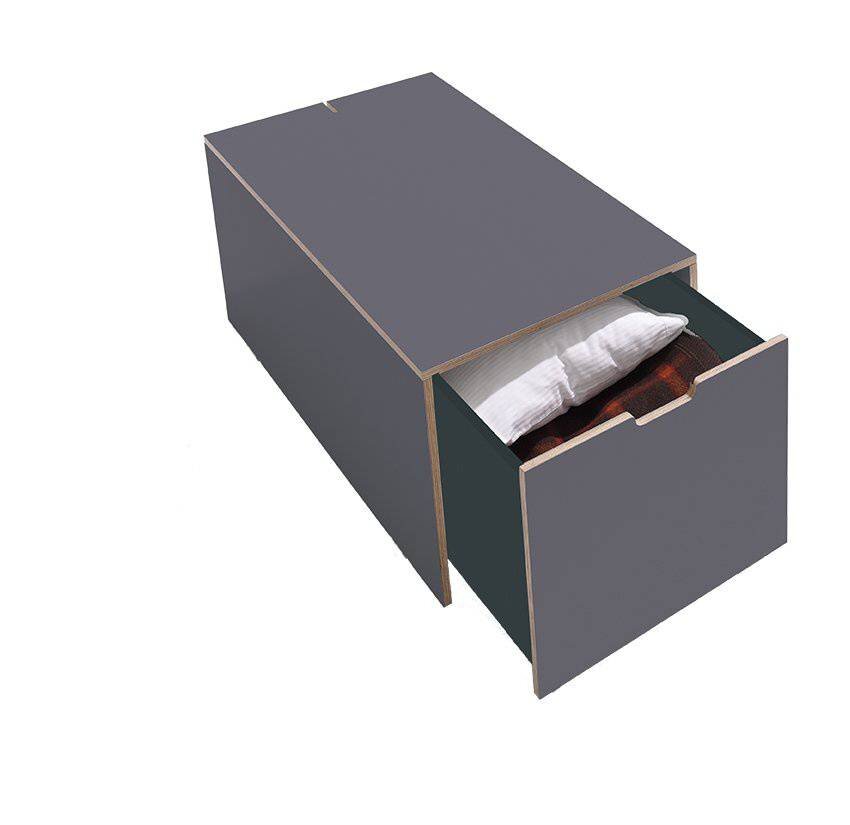 Der neue Bettkasten für die Stapelliege verfügt über einen geräumigen Schubkasten und eine simple aber dennoch innovative Kabelführung auf der Rückseite. Er bietet somit viel Stauraum und zugleich eine große Ablagefläche. Die perfekte Ergänzung des Klassikers.