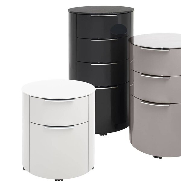 Ein klassischer Allrounder. Die funktionale Rundkommode CONGA ist vielseitig zu nutzen und wird einfach dahin gerollt, wo sie gebraucht wird. Es gibt die Kommode – bei gleichem Durchmesser – in 3 Höhen, alle Modelle haben 5 Möbelrollen. Zur Wahl stehen unterschiedliche Schubkastenkombinationen, mit und ohne offene Fächer, je nach Nutzungswunsch. Die hohe Kommode gibt es zusätzlich auch als Barvariante. Der untere sowie der mittlere Schubkasten dieses Modells haben eine Innenausstattung mit verchromten Drahtbügeln. Im unteren Schubkasten können auf diese Weise bis zu 8 Flaschen sicher Platz finden, der mittlere Schubkasten ist für Gläser vorgesehen. Der obere Schubkasten hat, wie die beiden anderen auch, einen grauen Antirutschbelag. Der individuelle optische Gestaltungsspielraum ist bei allen Modellen gross, mit einer nuancenreichen Palette an matten und Hochglanz-Lackfarben für den Korpus. Auch die Abdeckplatte kann in einer matten oder Hochglanz-Lackfarbe gewählt werden, außerdem gibt es sie in Nussbaum, glänzend verchromt, in weißem oder schwarzem, poliertem Marmor, sowie aus Glas – in Optiwhite oder satiniert -, jeweils mit passend lackierter Unterseite. Abdecktablare in matten Lackfarben, aus Nussbaum oder Eiche in verschiedenen Ausführungen komplettieren die Variationsmöglichkeiten. Die Flachgriffe sind entweder glänzend verchromt oder in Korpusfarbe lackiert. Ob als perfekter Nachttisch, praktischer Ordnungshelfer im Homeoffice, elegante Kommode im Wohnzimmer oder als mobile Bar auf der Terrasse - dieses Möbel ist überall einsatzbereit.