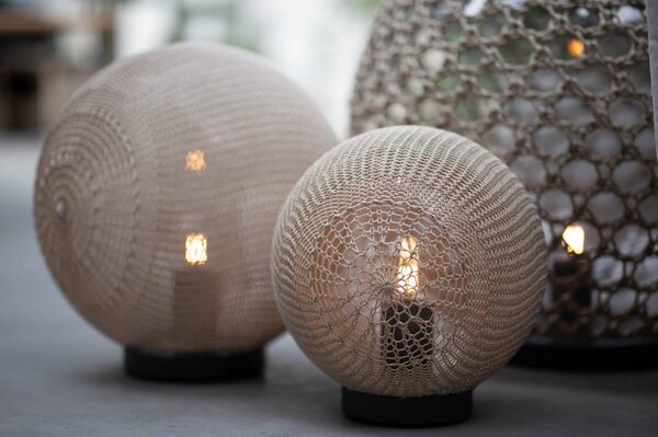 Monsieur Tricot ist eine Kollektion gestrickter Outdoor-Beleuchtungskörper. Der belgische Designer Ilia Eckhardt experimentierte mit innovativen Stricktechniken und witterungsbeständiger Schnur. Seine handgefertigten Kugel-und Tropfenleuchten verströmen eine warme Glut und werfen wunderschöne Schatten.