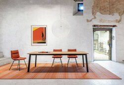 Auszugstisch mit gedämpfter Ausschwenktechnik. LIOLA wird seitlich erweitert, indem das Gestell nach aussen gezogen wird. Eine gedämpfte Ausschwenktechnik erleichtert die Handhabung beim Öffnen der Klappeinlage. Die längs verlaufende Holzmaserung des Tischblatts setzt sich in den Einlageplatten fort. Die Einlegeplatte ist als Option auch in MDF erhältlich. Der Tisch kann auch als "Fix-Tisch" bestellt werden!