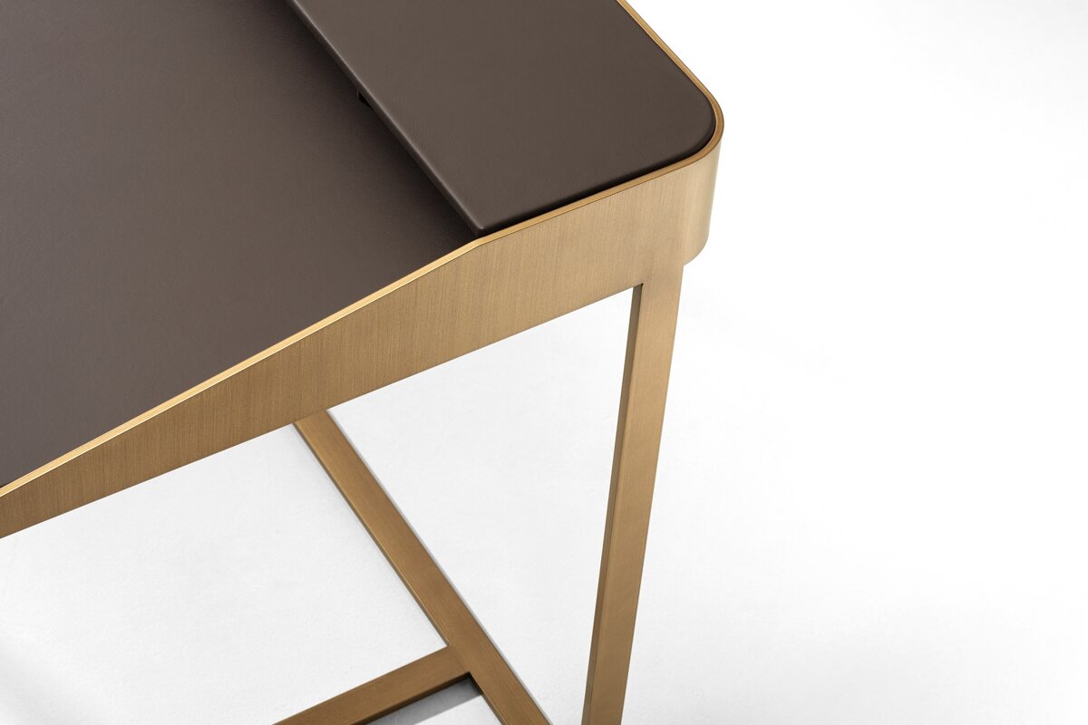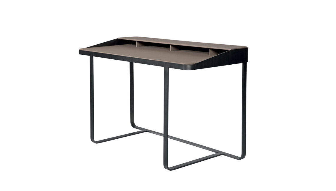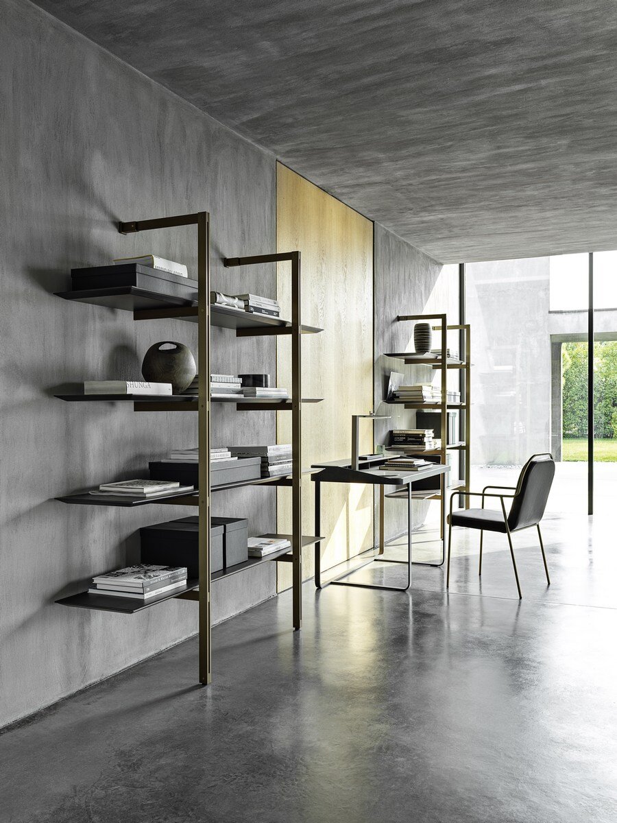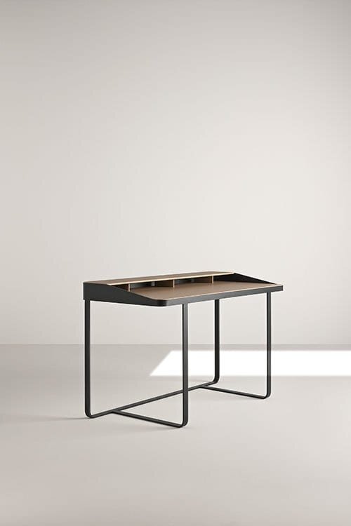 Funktionalität, Schlichtheit und Einfachheit werden von Twain in einem Schreibtisch mit modernem Design beschrieben, der eine Metallstruktur mit Regalen und Details aus Leder kombiniert. Dieser Schreibtisch ist perfekt für Heimarbeitsbereiche geeignet und verbindet Robustheit mit eleganter Ästhetik. Durch diese Mischung aus Materialien entsteht ein Arbeitsumfeld, das sowohl praktisch als auch stilvoll ist.