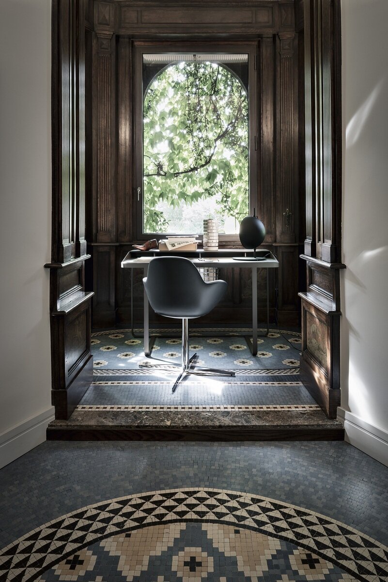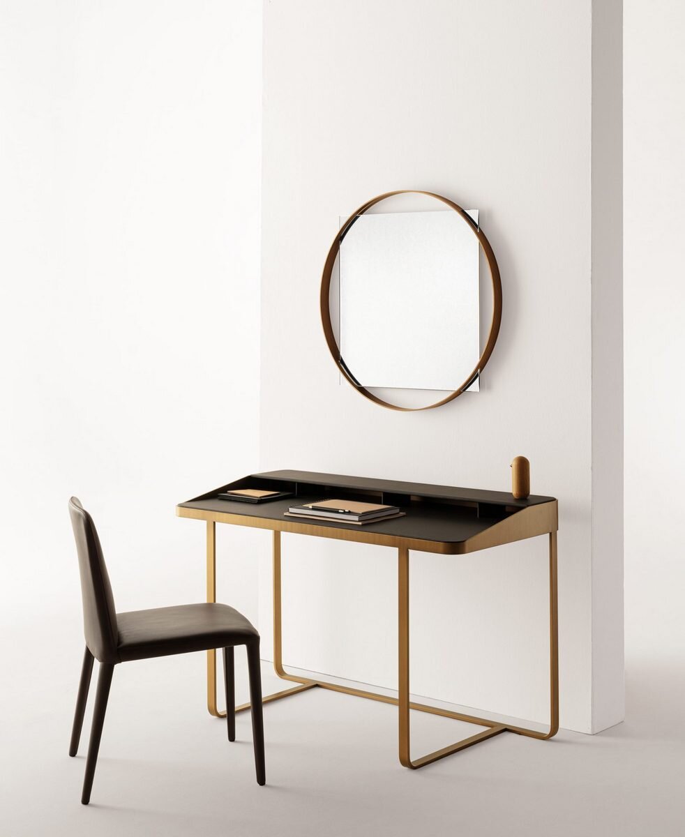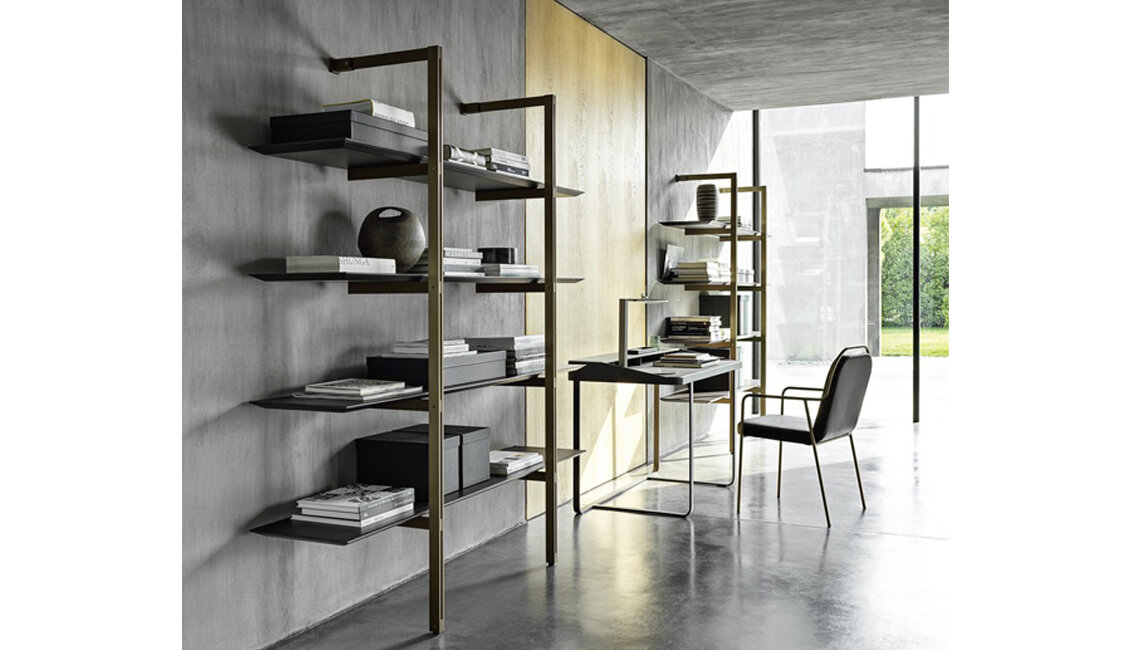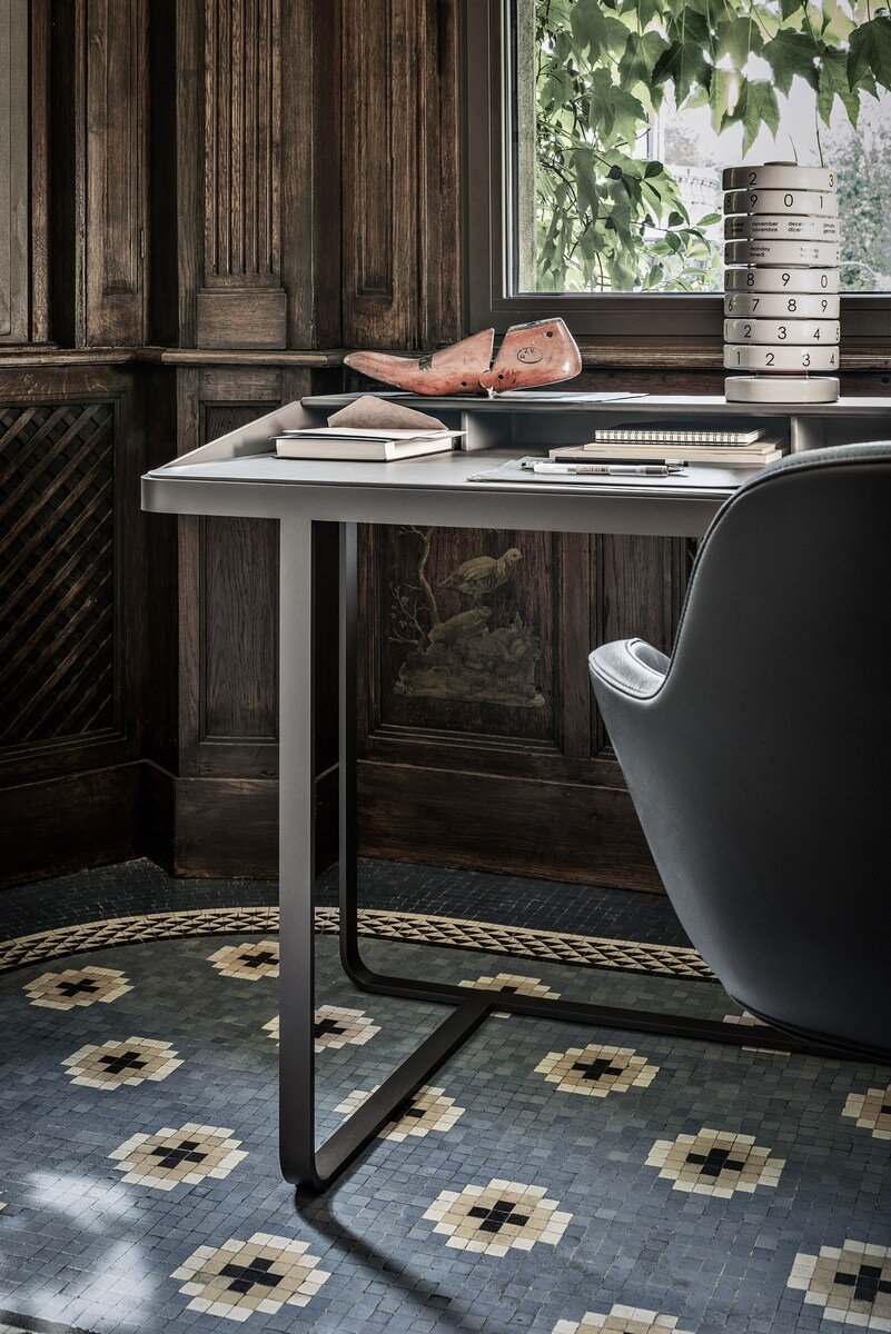 Funktionalität, Schlichtheit und Einfachheit werden von Twain in einem Schreibtisch mit modernem Design beschrieben, der eine Metallstruktur mit Regalen und Details aus Leder kombiniert. Dieser Schreibtisch ist perfekt für Heimarbeitsbereiche geeignet und verbindet Robustheit mit eleganter Ästhetik. Durch diese Mischung aus Materialien entsteht ein Arbeitsumfeld, das sowohl praktisch als auch stilvoll ist.
