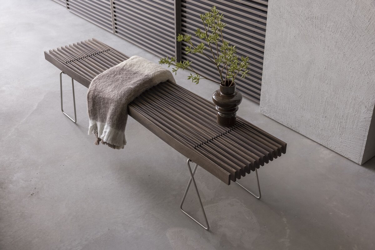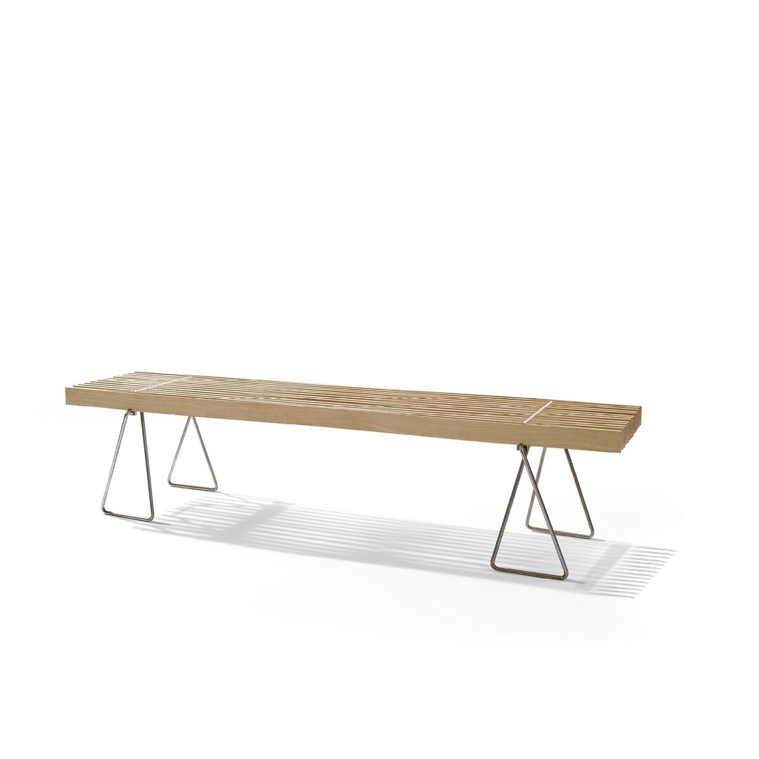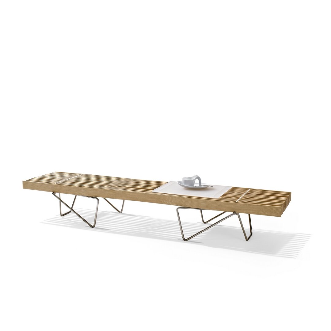 Konstruktion aus verleimten und gespannten Holzlamellen aus roher, massiver Esche oder Räuchereiche. Diese sind am Untergestell (CNS) mit weissem, resp. schwarzem Polyamidseil verschnürt. Zur Sitzbank sind passende Filzkissen erhältlich, für den Sofatisch gibt es eine transparente Servierablage. Wir beraten Sie gerne in unserer Ausstellung.