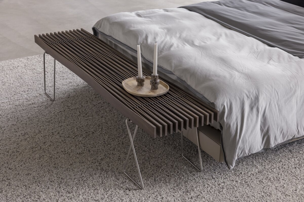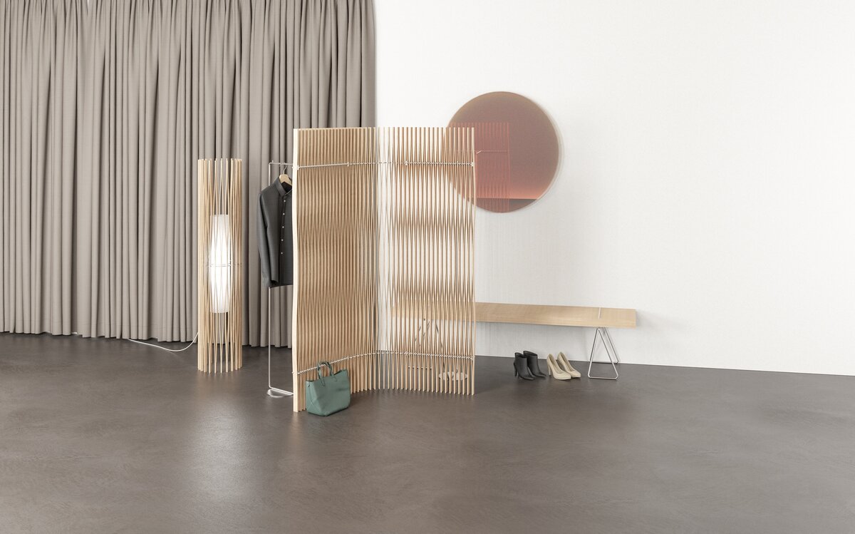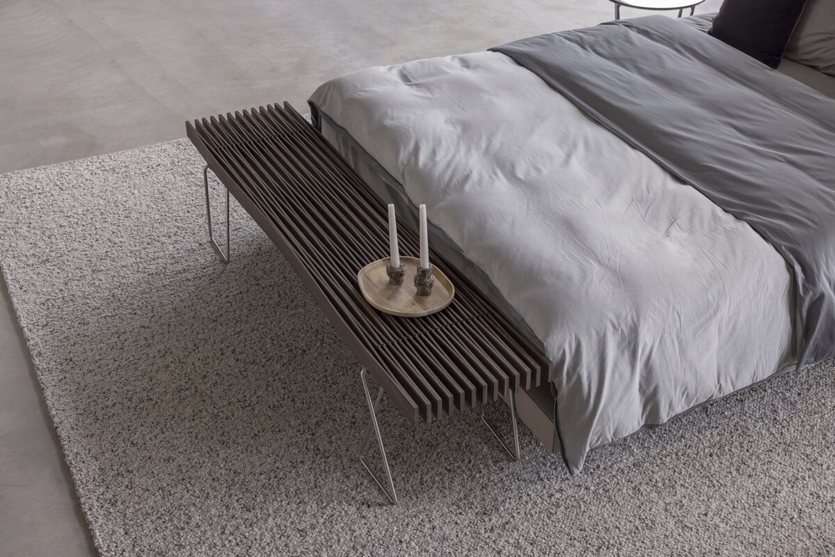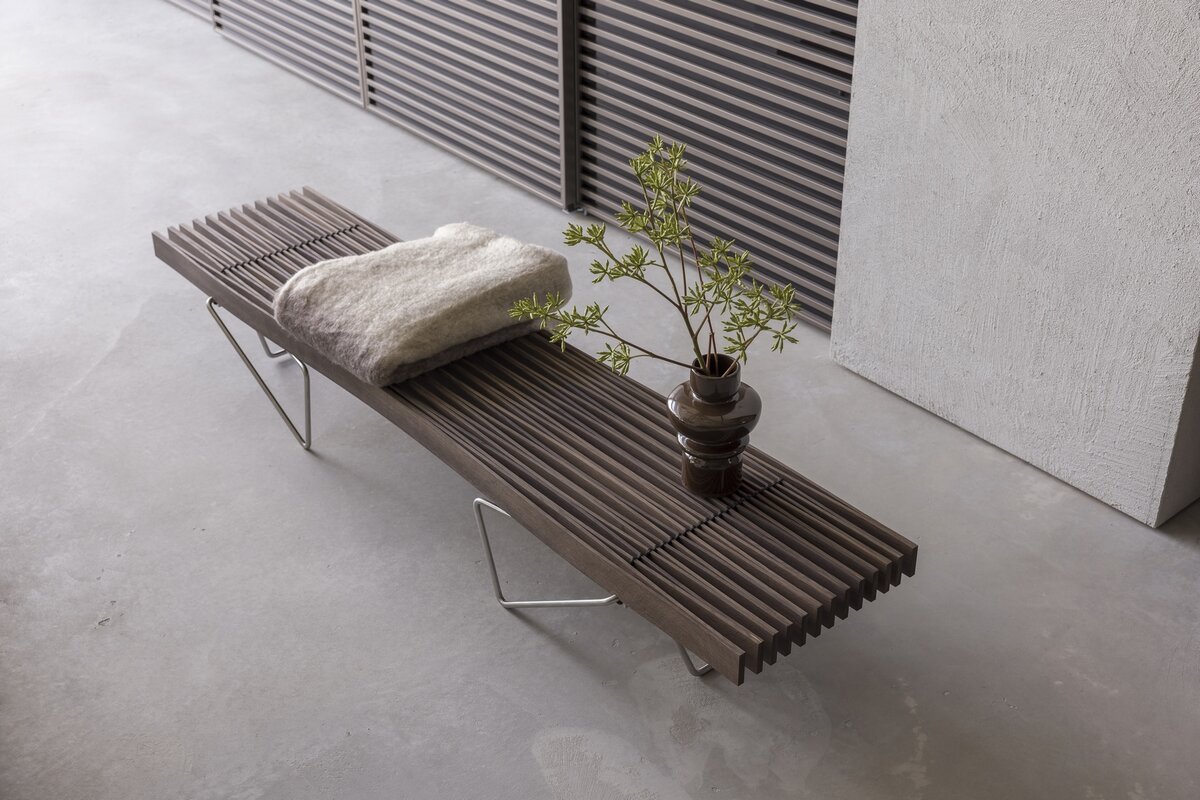 Konstruktion aus verleimten und gespannten Holzlamellen aus roher, massiver Esche oder Räuchereiche. Diese sind am Untergestell (CNS) mit weissem, resp. schwarzem Polyamidseil verschnürt. Zur Sitzbank sind passende Filzkissen erhältlich, für den Sofatisch gibt es eine transparente Servierablage. Wir beraten Sie gerne in unserer Ausstellung.